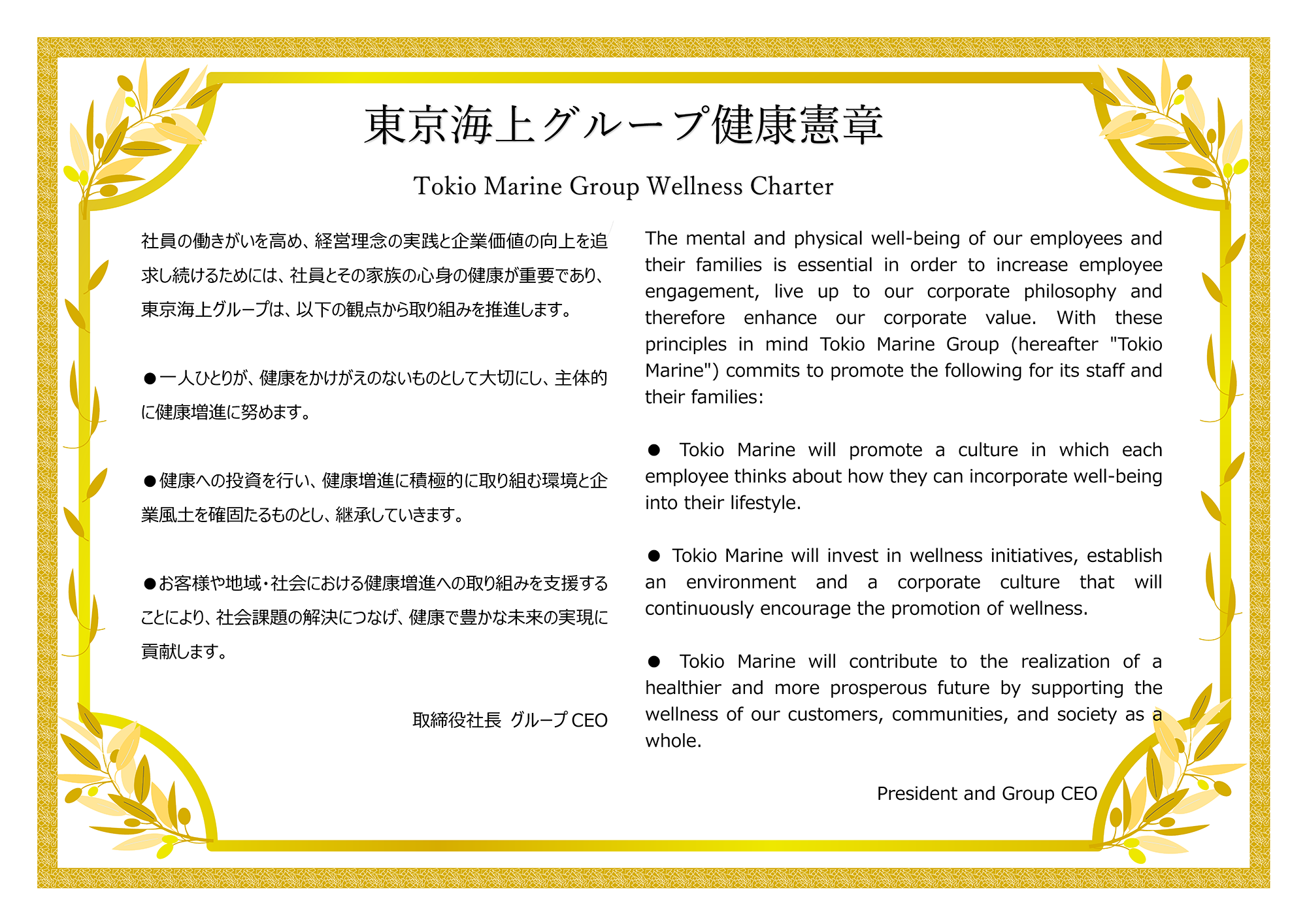 健康に関する社員の行動規範として、2019年に「東京海上グループ健康憲章」を制定しました。社員とその家族の健康を何よりも大切にし、その健康維持・増進に積極的に投資していくことや、健康経営を通じて目指すところなどを明確に示しています。また東京海上日動では健康経営宣言として、「お客様に選ばれ、成長し続ける会社"Good Company"であるために最も大切な原動力は社員であり、東京海上日動は社員と家族の心身の健康の保持・増進に積極的に取り組みます」と掲げています。