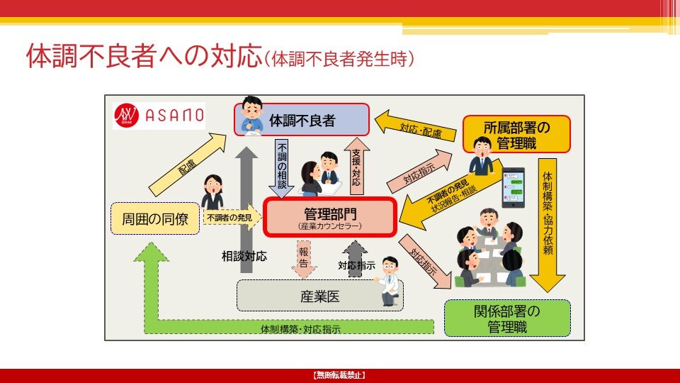 - 相談を受けた場合は、まずは相談窓口の担当者と管理部門の部長で対応を相談しています。そのうえで、話してよい範囲や内容を従業員に確認し、産業医や関係する所属部署内外の管理職とも適宜連携しています。
