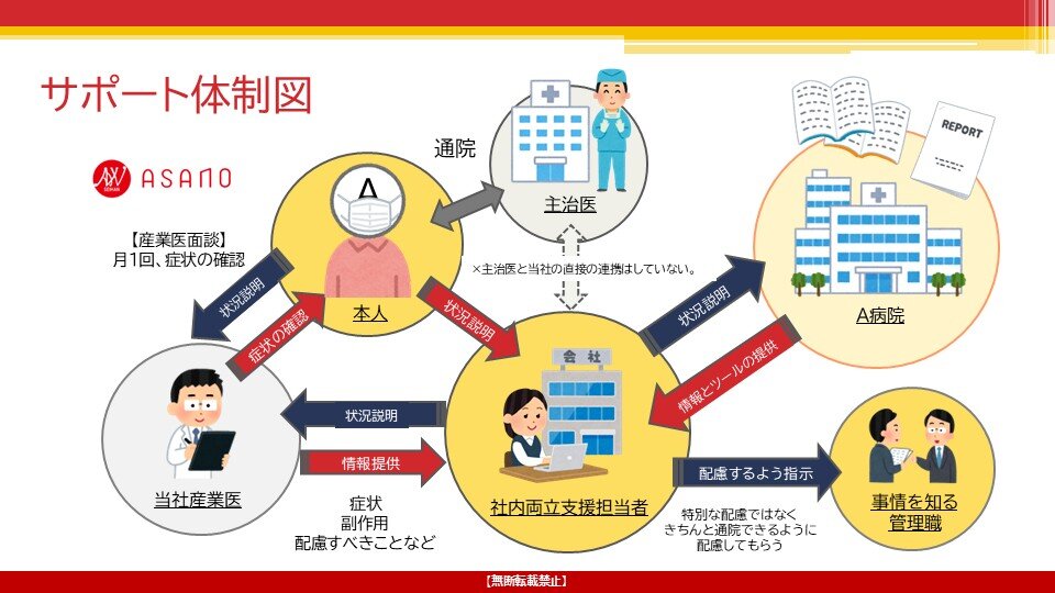 <がんに罹患した従業員を支援した際のサポート体制図>(同社提供)
