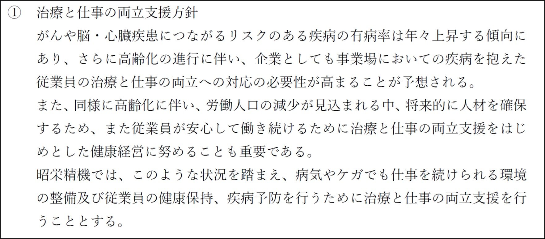 治療と仕事の両立支援の方針を明示し、「病気=退職ではなく、必ず相談してほしい」と周知