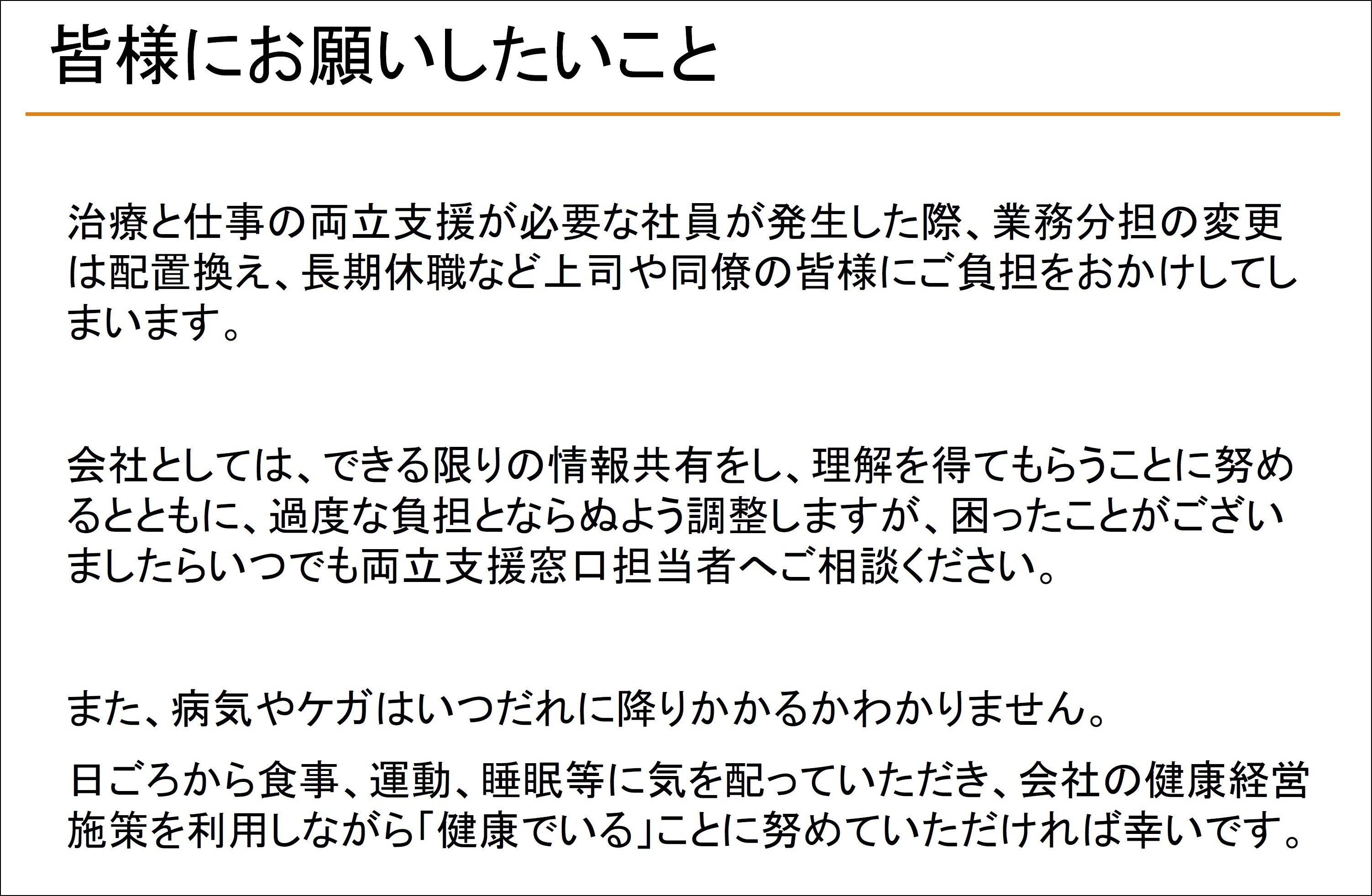 - また、治療と仕事の両立支援において管理職は大きな役割を担いますが、管理職への教育が十分にできていないと感じています。今後、治療が必要になった部下に対する対応方法などを管理職研修で取り扱いたいと考えています。