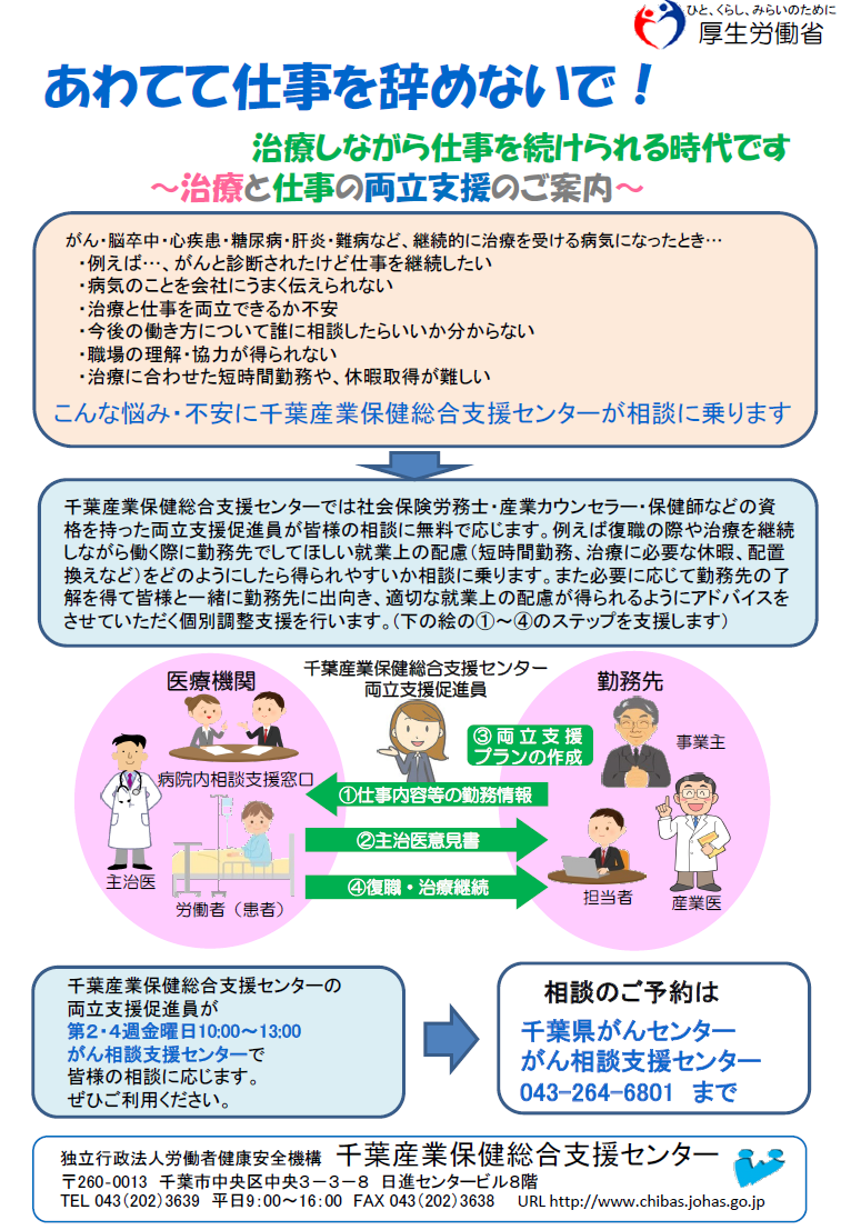 - 月に2回、産業保健総合支援センターの出張相談窓口を設け、同センターの両立支援促進員が治療をしながら仕事を続けたい患者さんの相談に応じています。「がんと診断されたけど仕事を継続したい」「病気のことを会社にうまく伝えられない」「治療と仕事を両立できるか不安」「今後の働き方について誰に相談したらいいか分からない」「職場の理解・協力が得られない」「治療に合わせた短時間勤務や、休暇取得が難しい」などといった相談が寄せられています。