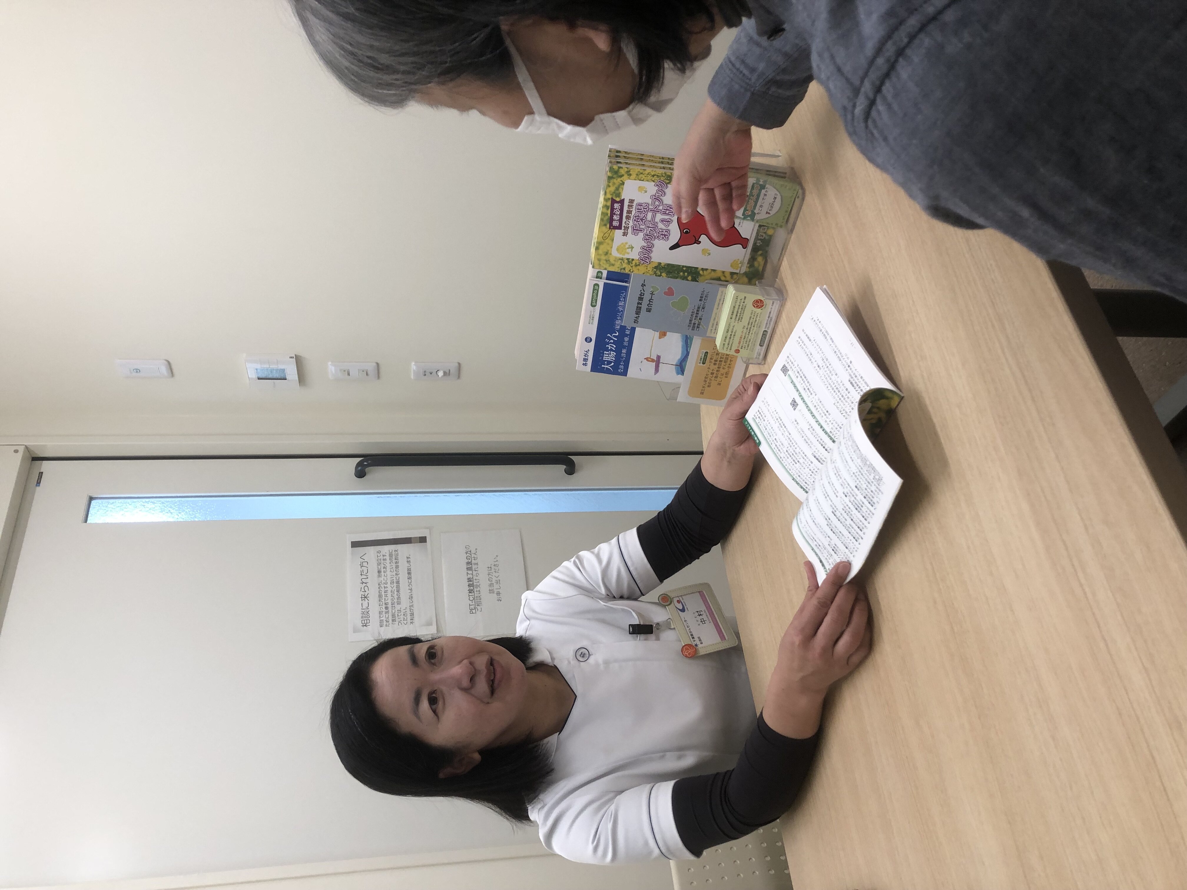 - これらの取組を周知する目的で、初診の外来患者さんまたは再診の外来患者さん(ただし、前回の受診から数か月経った患者さん)に対し、外来患者さんが診察・会計を待っている間に、患者さん1人ひとりに相談員ががん相談支援センターの案内を行っています。その際、患者さんが働いているかどうかを尋ね、働いている場合、勤務状況などを聞き取り、取組を案内しています。