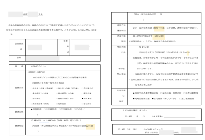 - また、当時は従業員も気が動転している状態であったため、事実を正しく把握するために主治医から直接話を聞けるよう、従業員に依頼しました。主治医との面談には、「事業場における治療と職業生活の両立支援のためのガイドライン」の勤務情報提供書を参考に、当社が作成した勤務情報が記載された書類を持参しました。当社は産業医を選任していないため、主治医との連携が重要です。必要に応じて、主治医から意見を聞き、より適切な働き方や配慮を検討しました。