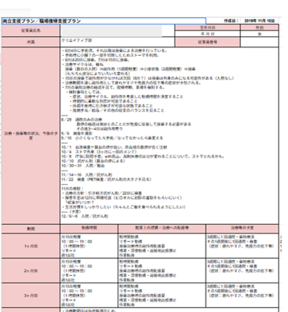 - その後、休業を経て職場復帰が見えてきた段階でガイドラインをもとに「両立支援プラン/職場復帰支援プラン」(自社様式)も作成しました。今後の治療予定や業務上の配慮、面談の時期、必要な資料のリンクなども記載しています。
