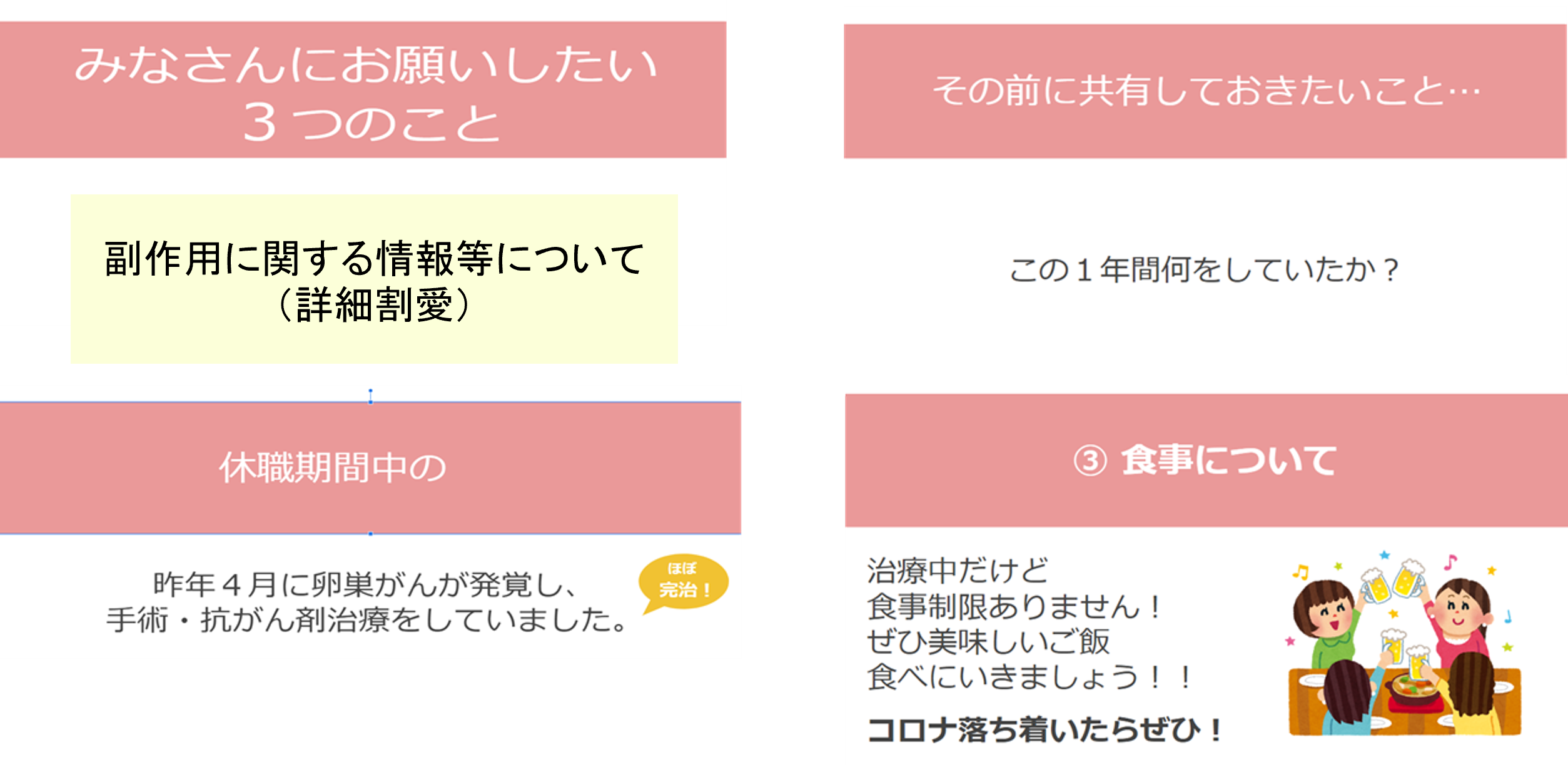 - 職場復帰日には、社内向けにオンラインで職場復帰の挨拶をしてもらいました。挨拶の中では、従業員本人から副作用に関する情報や食事などについて同僚たちに話しており、周囲の理解につながったと思います。