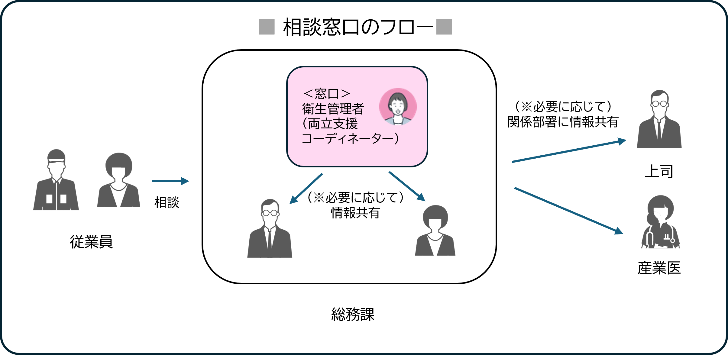 - 相談窓口では、治療と仕事の両立だけでなく、業務のことや上司との関係など、幅広い内容を受け付けています。衛生管理者が相談を受け付けた後は、相談者の希望を確認した上で、必要に応じて、上司、産業医など関係者や関係部署につなぐようにしています。