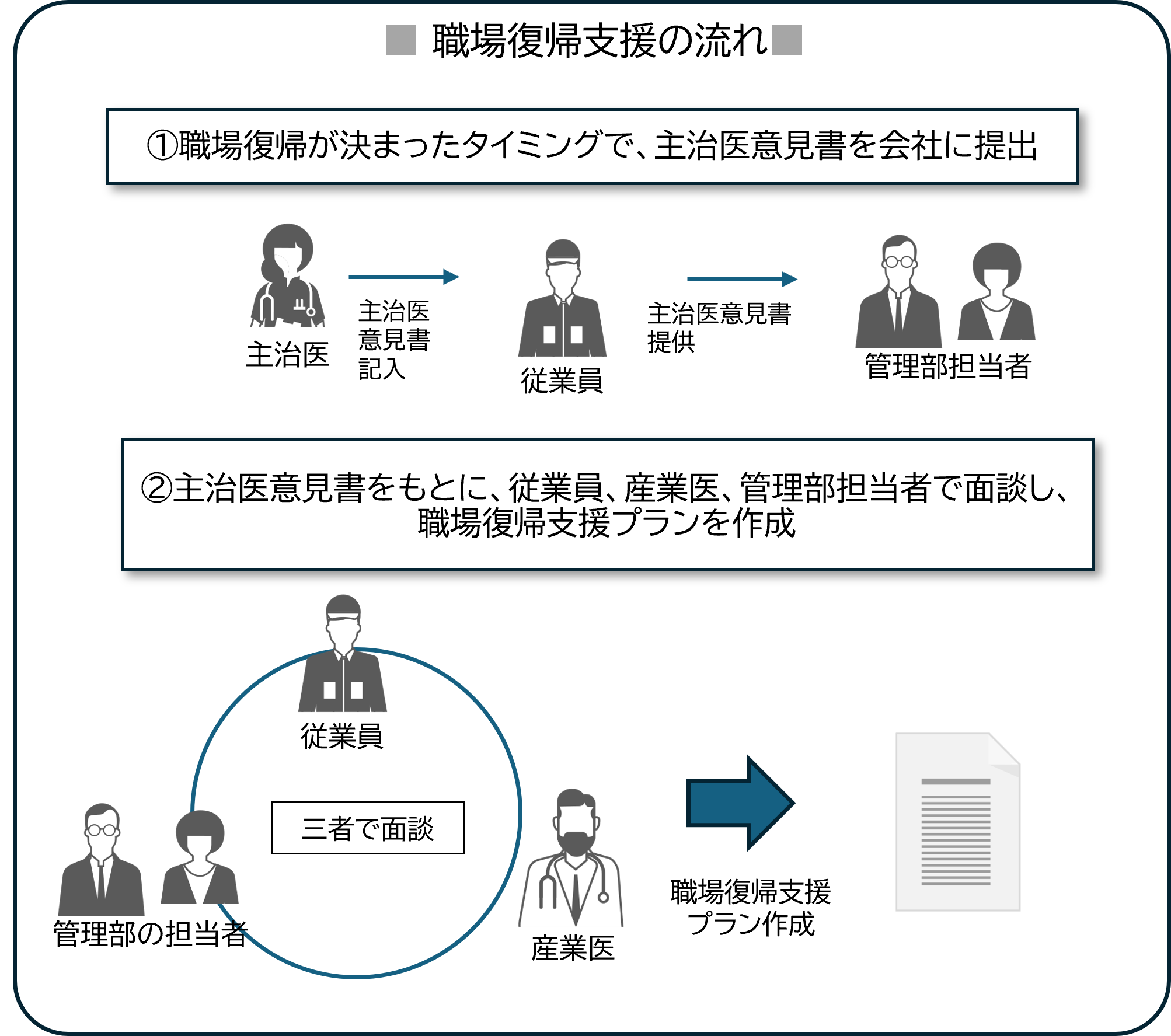 - 休業が必要となった従業員については、職場復帰が決まったタイミングで、どのような業務であれば可能かなど、従業員を通じて主治医意見書をもらいます。その情報をもとに、従業員・産業医・管理部担当者で面談をしながら、職場復帰支援プランを作成していきます。プランには、例えば、復帰後1か月間は勤務時間を短縮し、運転などの業務は控える、といった内容を記載します。