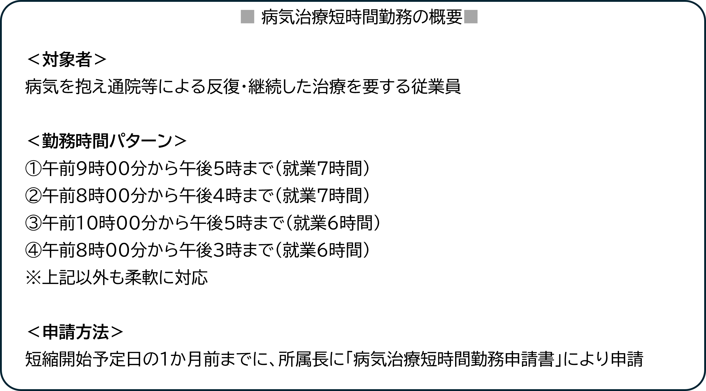- 「育児・介護休業・病気治療等に関する規則」の中に、治療と仕事の両立のために利用できる「病気治療短時間勤務」の規定を盛り込んでいます。