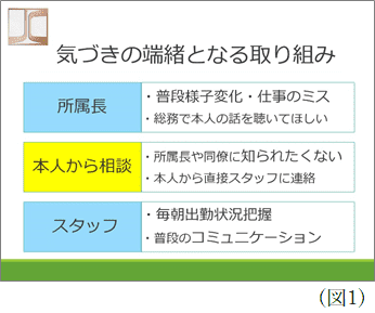同社には総務部に所属する衛生管理者2名、給与労務担当1名、そして総括の1名の計4名が両立支援を含む、産業保健の施策全般を担っている。医療専門職ではない社員が、離れた現場にいる社員一人ひとりの体調を管理するために、全所属長と密に連携を取っており、異変に気づく端緒となっている(図1参照)。