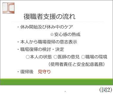 同社の現制度では、休職は最長1年6か月。その間に復帰できなければ退職となる。会社には「使用者責任」と「安全配慮義務」があり、休職者復帰の判断が慎重になることはどの企業も同じだ。「制度面では大企業のようにはできませんので、病気の特性に応じて柔軟に対応しているのが現実です」と、近藤氏。同社の復職者支援の流れは(図2)のようになっている。