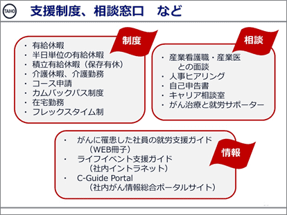 "情報"の面では、『がんに罹患した社員の就労支援ガイド』と題したWEB冊子や社内イントラネット、社内がん情報総合ポータルサイトを作成した。これらは有志の人事部員による就労支援チームによって作成されたもの。