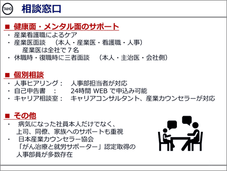 その上で、病気に対する理解を深めると共に、職場内ではお互いに支え合う雰囲気づくりが必要だという。三田氏が特に強調することは、"相談してくれてありがとう"という声が聞こえてくる風土だ。「罹患した社員から相談された上司や同僚は、まず"大丈夫か?"とか"あの業務はどうするのか?"等と、口にしてしまいがちです。本人は大丈夫ではないから会社に相談しているのに"大丈夫です"としか回答できないものです。そして、"私よりも、仕事の心配?"と不信の念をいだくことになってしまいます。その代わりに『相談してくれてありがとう』と、上司や同僚、友達、窓口相談者等のすべての人が応えられれば、本人も安心して『何ができるのか、何をしたいのか』を発信できますし、職場ではどういう配慮が必要なのかを話し合うことができます。職場内でのちょっとした配慮や気遣いで、働きやすい職場になっていくのです」と、語る。