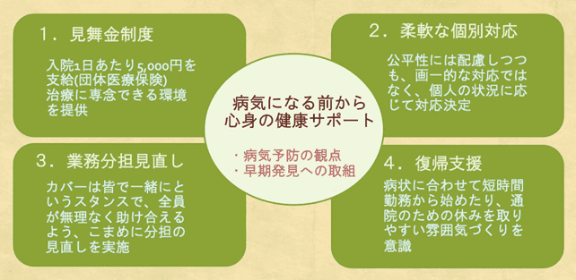 最終的に同社が採用した方法は、全額会社負担で団体総合医療保険に加入し、入院・手術見舞金制度を設けること。これは、病気療養による減収の補填を目的としたシンプルな制度だが、そのわかりやすさが逆に治療も仕事も阻害しないという効果をもたらした。過去にこの制度を利用して休職した従業員が7人いるが、今では病気を患う以前よりも元気に、前向きに働いている。