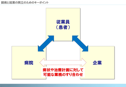 治療と仕事の両立支援において、病気になった本人の現状把握の他、医療機関等との病状確認、治療の計画、どのような業務ならば継続が可能なのか等の情報のやりとりは必要不可欠である。「病気になった本人と、受け入れる側の双方の様々な不安を取り除くためには、病院と企業の連携による『適確な情報共有』が必要です」と、大野氏はその重要性を強調する。(図参照)