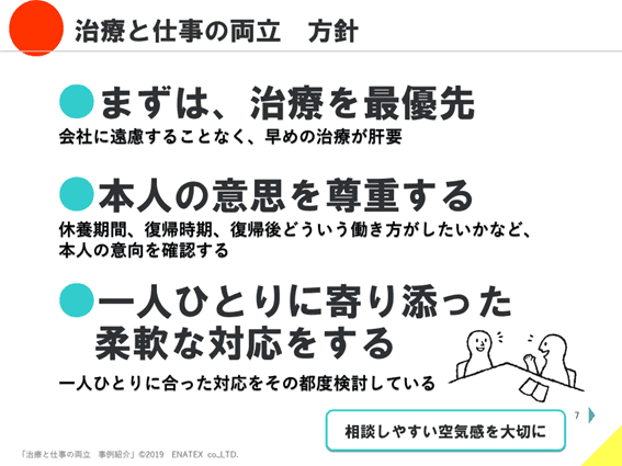 こうした同社の健康経営の姿勢から、治療と仕事の両立支援にも自然と取り組むようになった。坂元氏が所属する総務部では、治療に限らず、育児、介護も含めた両立支援に対応する相談窓口を設けている。同社の治療と仕事の両立支援の方針は以下のとおり。