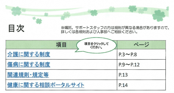 図1 結婚・出産・育児・介護等に関するサポートBOOK(介護・傷病編の目次)