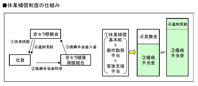 京セラ懇親会の休業補償制度は、不支給となる給料日に基本給・都市勤務手当(住宅手当)・家族支援手当(扶養手当)の80%を懇親会から対象者に支払い、健康保険組合から後日支給される傷病手当金が懇親会に入金される制度。傷病手当金のほうが高い場合は差額を後日追加支給し、安い場合には差額を見舞金として処理するため、一旦支給された額は確実に守られる。