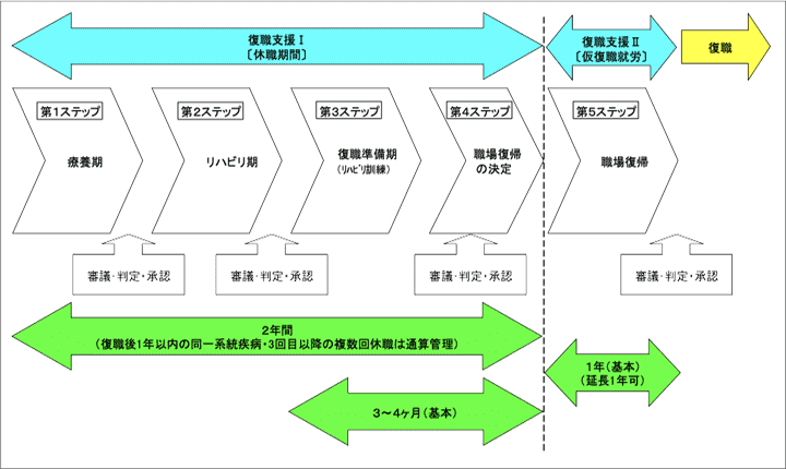 療養期→リハビリ期→復職準備期→職場復帰の決定→職場復帰となります。