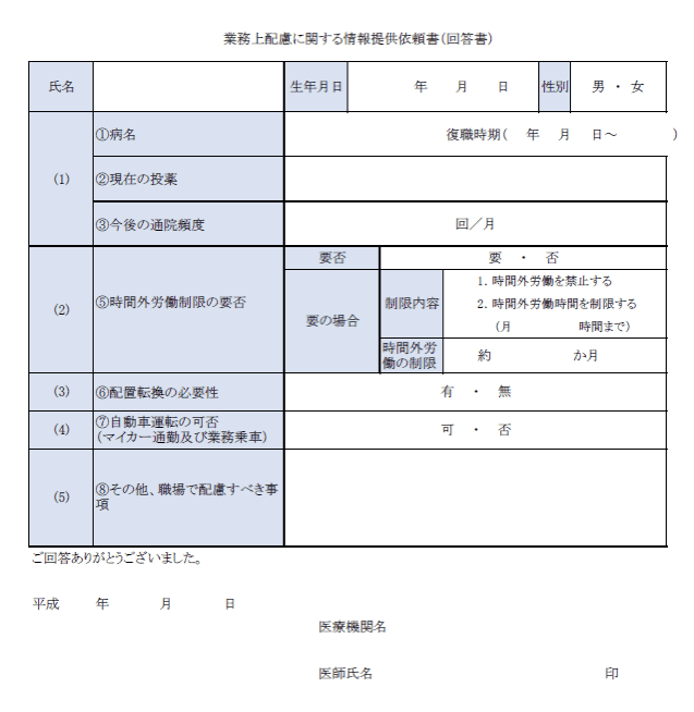 業務上配慮に関する情報提供依頼書(フォーマット)