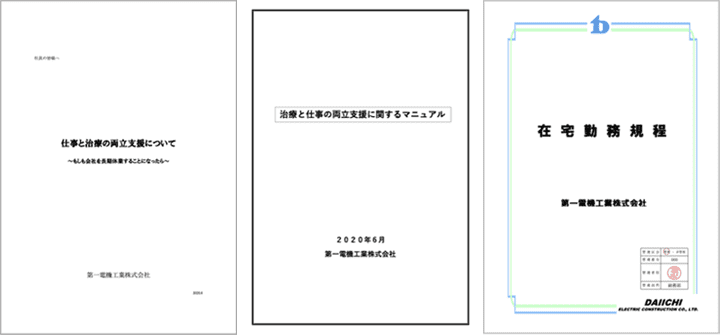 社員向けに「仕事と両立支援について」「両立支援のマニュアル」などのマニュアルを新しく作成し、試し出勤実施規程や在宅勤務規程も整備しました。社内イントラネットでこれらのマニュアルは共有され、ポスター等の掲示もしています。