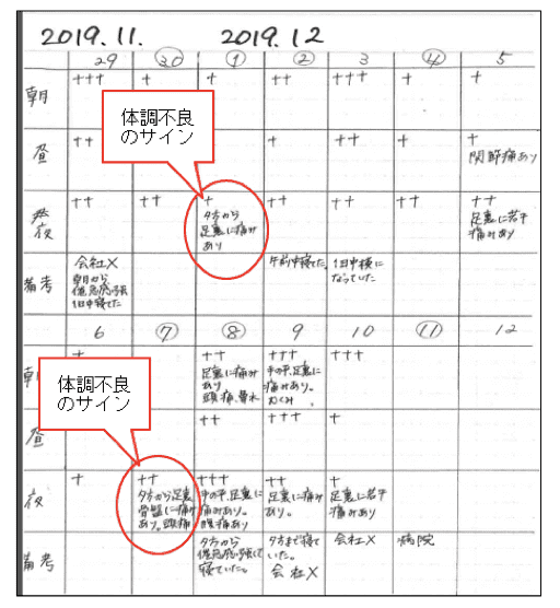 退院後は産保センターから協力を得ました。本人に体調の記録をつけてもらうことで体調の波がわかるようになり、業務の計画が立てやすくなったり、病院への説明時には治療の参考にもなりました。どんな病気でも自分で体調を把握するのは効率的で、効果的に治療を受けることができるのでおすすめです。