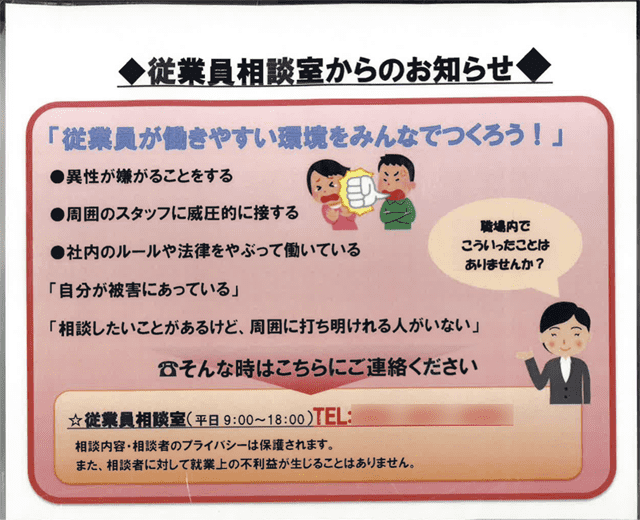 面談をするのは正社員だけですが、「従業員相談室」の電話を設置し、直通で私のデスクにかかってきます。店舗の従業員控室には、この相談室のポスターが掲示されていて、誰もが利用可能です。相談内容はどんなことでもよく、パワハラや職場の人間関係から、プライベートな相談、最近ではカスタマーハラスメントの相談などもあります。