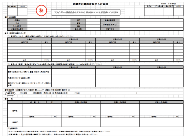 「休職者の職場復帰受入計画書」により、復帰1か月後、2か月後、3か月後の業務内容を段階的に変化させて職場復帰を支援している
