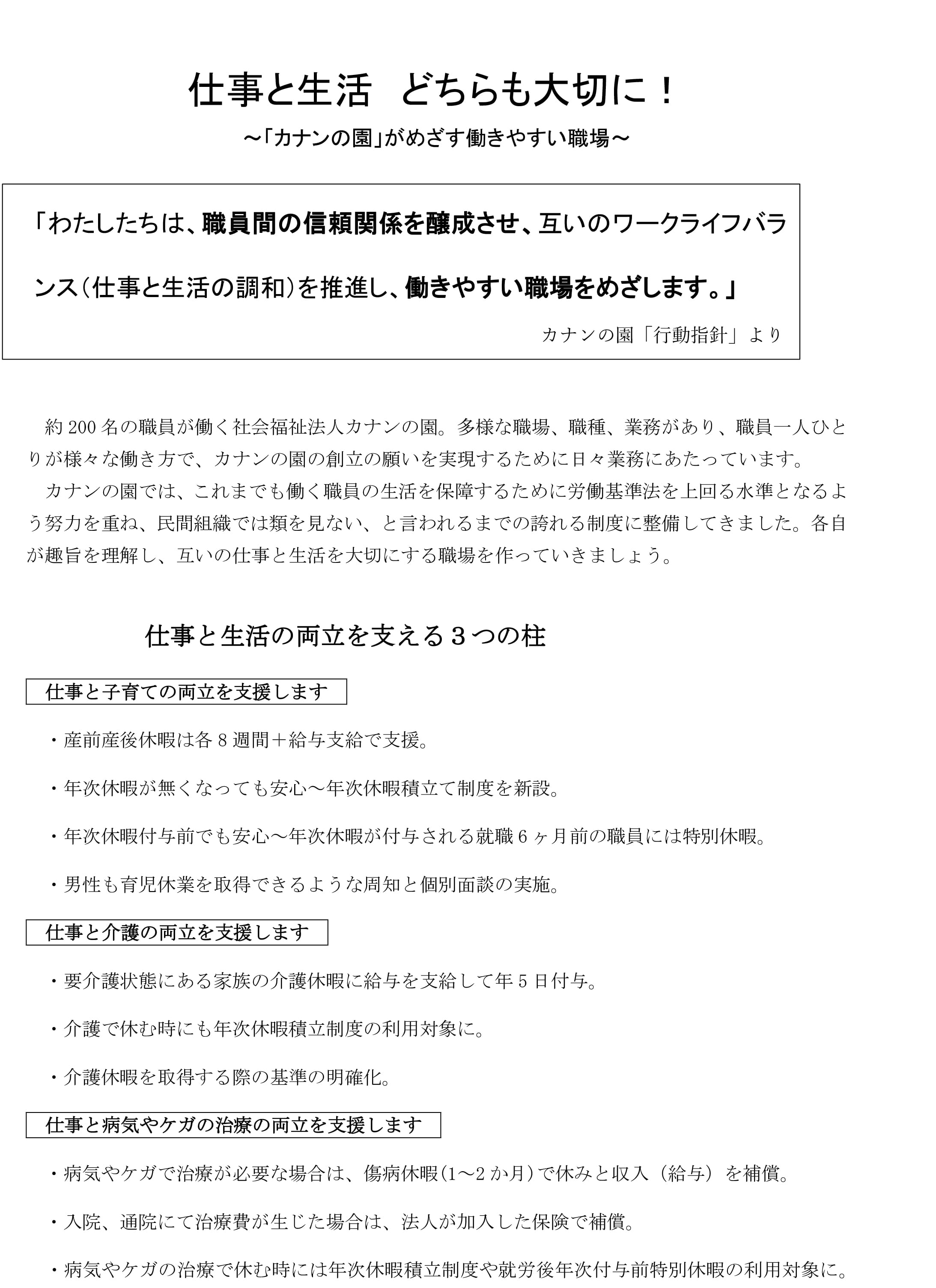 社会的に「ライフワークバランス」という言葉が使われるようになり、法人としてもそのような視点で多様な人材が個々の状況や希望に合わせて働ける職場へ転換する必要性を感じました。また、働き盛りの職員の長期治療などが必要なケースが数例あり、休業などを併用しながら働き続けるための生活保障をより充実させたく両立支援に取り組みました。