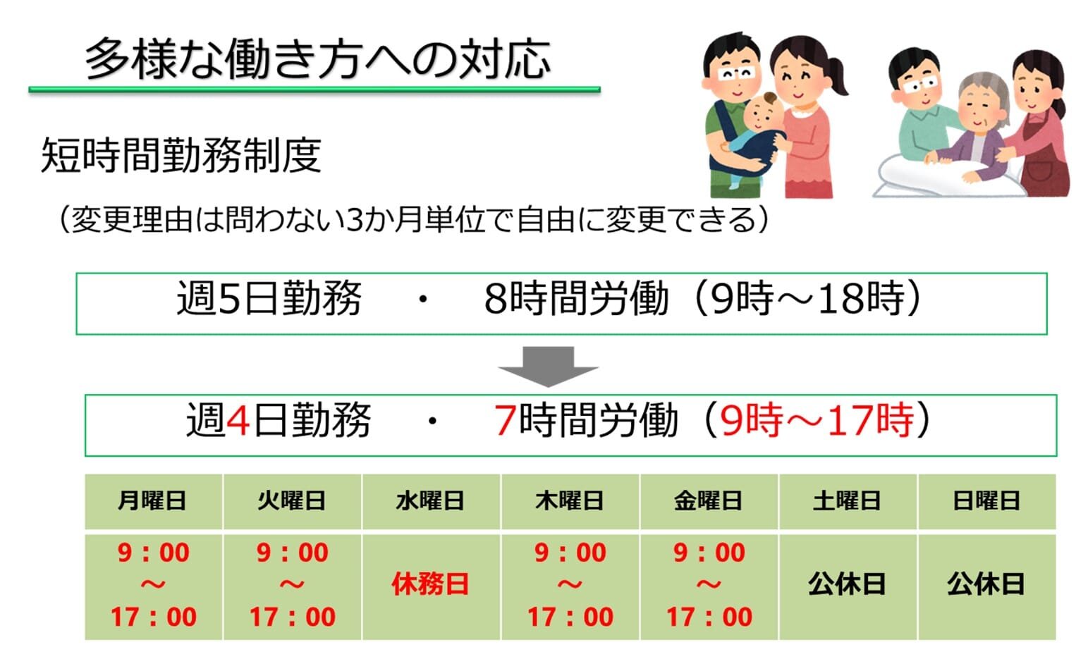 全職場で短時間正社員制度を導入して、理由を問わず週3日勤務・1日5時間勤務など多様な働き方ができます。ライフスタイルに合わせた制度利用で、本人の能力を生かしながら就労を継続することが可能となりました。