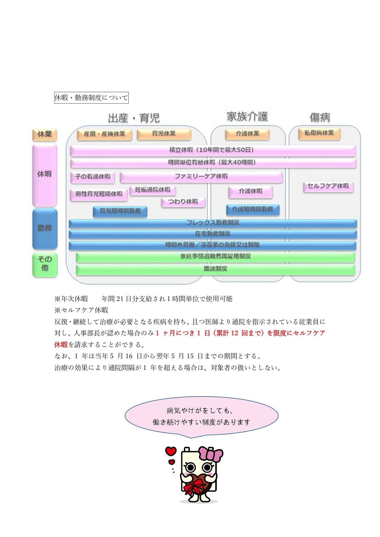 毎年1回、栃木産業保健総合支援センターへ依頼し「治療と職業生活の両立支援」の研修を開催しています。また、治療と職業生活の両立支援に関するリーフレットやWEB情報を従業員へ情報を提供しています。