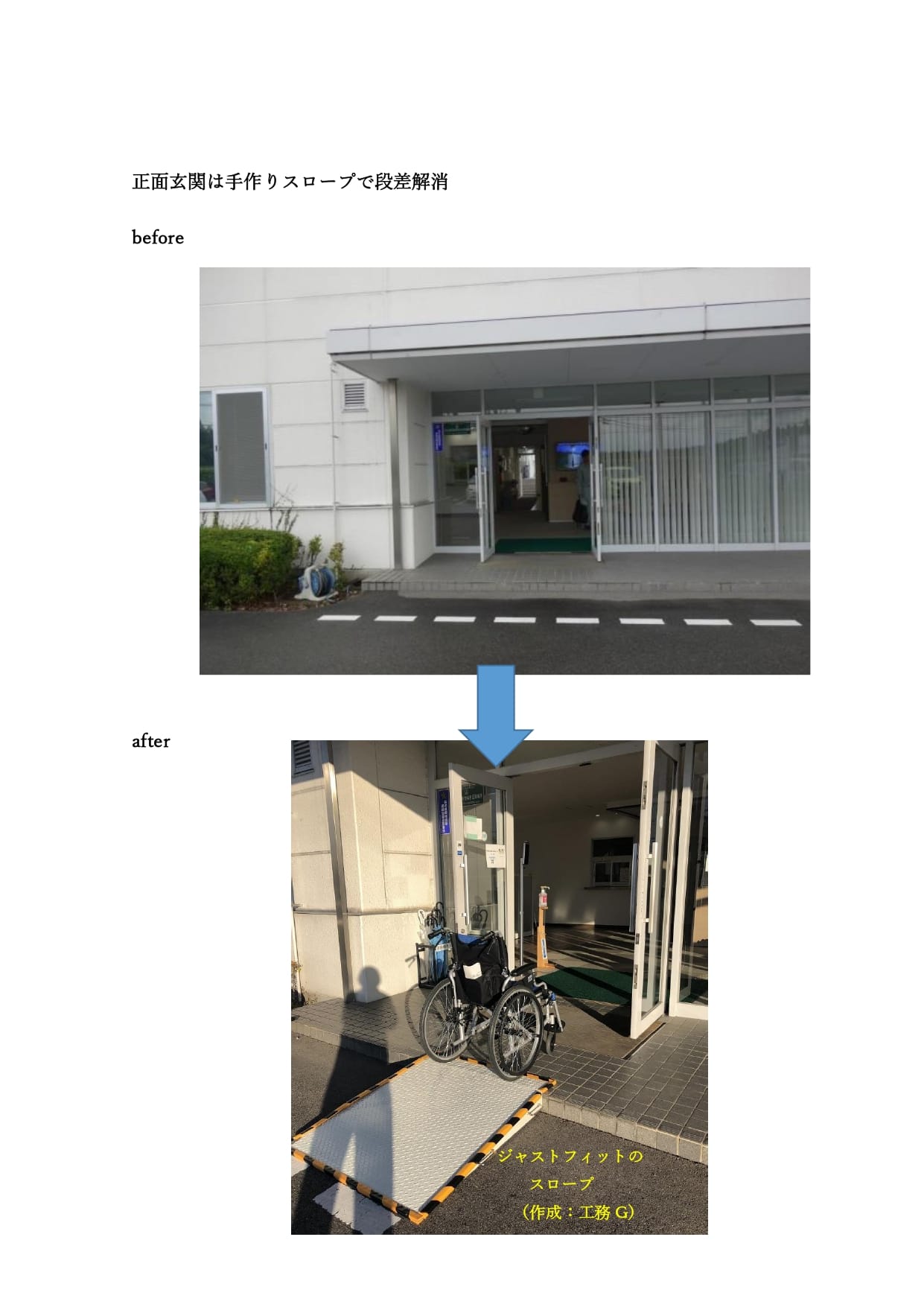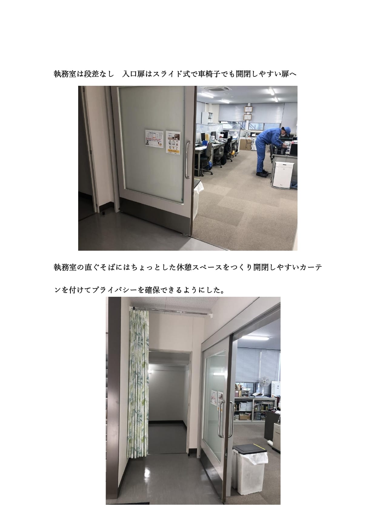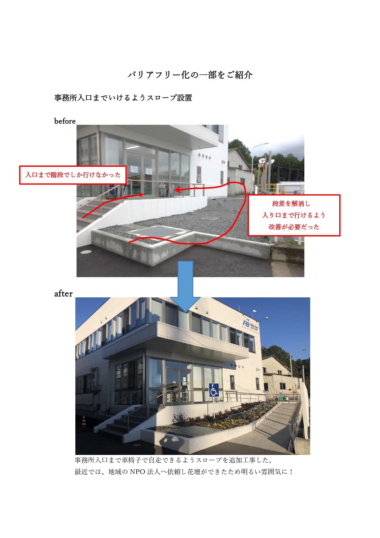 身体障がいのある従業員を迎えるための準備は過去経験がなかったため、独立行政法人高齢・障害求職者雇用支援機構栃木支部へ相談し、環境調整の仕方や設備費用(助成金)に関する助言をいただきながら、バリアフリー化に着工。(駐車スペース、専用トイレ、スロープの設置等)