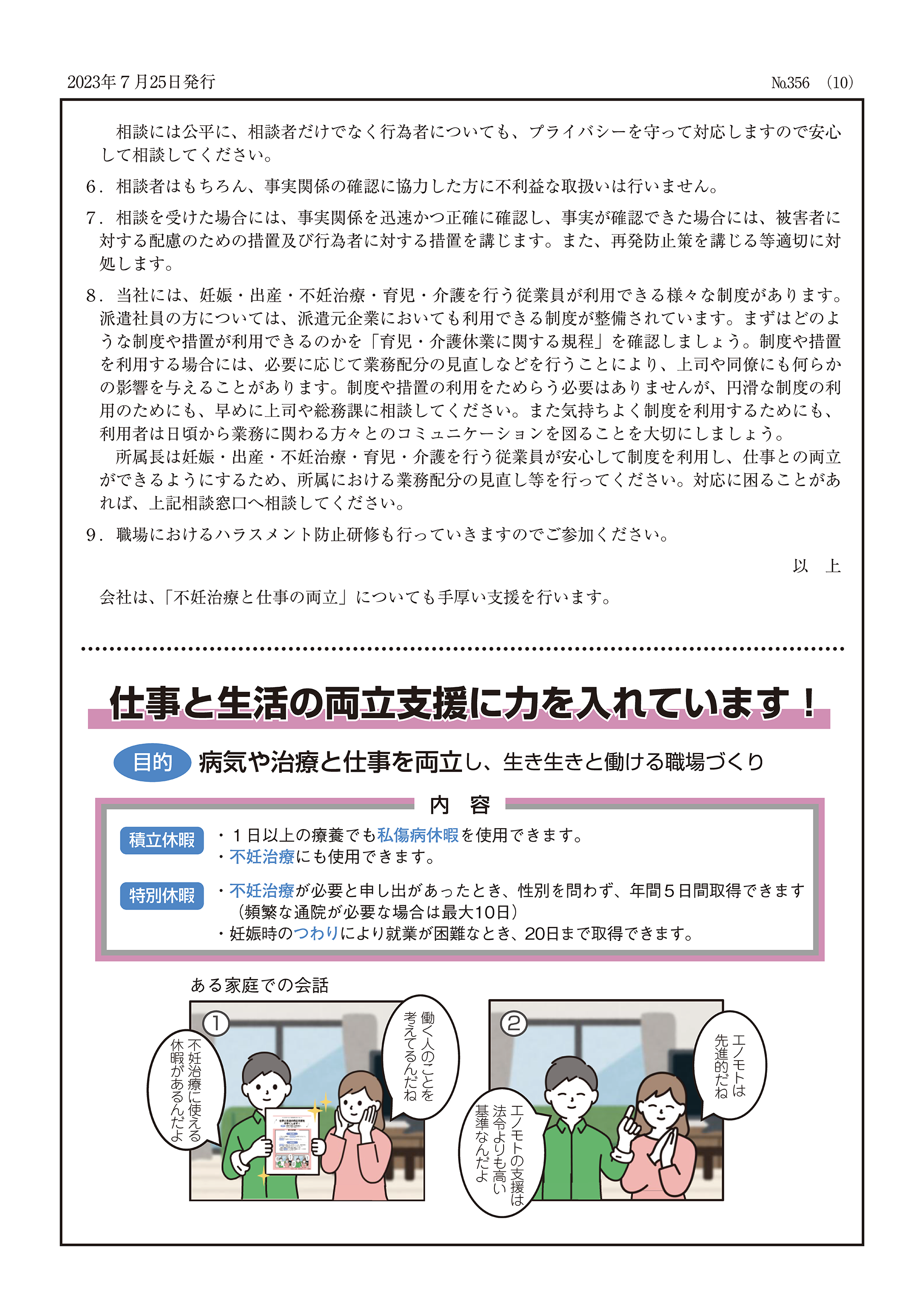 「エノモトポータル」という社内イントラネットに掲出している社内報(年4回)で「治療と仕事の両立支援」の方針を年1回は従業員に周知しています。