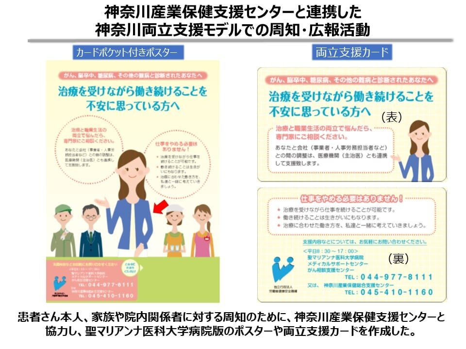 外来患者さんや家族を対象として、相談窓口と神奈川産業保健総合支援センターの相談窓口の電話番号を記載した当院オリジナルの"両立支援カード""両立支援ポスター・ボード"を作成し、院内・学内に広く掲示することで、周知活動を行っています。2018年度からは、"治療と仕事の両立支援チラシ"を入院時の案内冊子に組み込み、入院患者さん全員へ通知しています。また、当院の両立支援コーディネーターによるがん患者さん・家族を対象とした院内勉強会を通じ、患者さんが相談しやすくなるよう努めています。教育機関として、医学生への講義にも両立支援外来の取組を盛り込むなど、将来の医師への教育も積極的に行っています。さらに、地域に対しては、地域向け広報誌に両立支援外来の取組を掲載し、両立支援が必要な患者さんがいれば、気軽に紹介受診できるよう体制を整備しています。