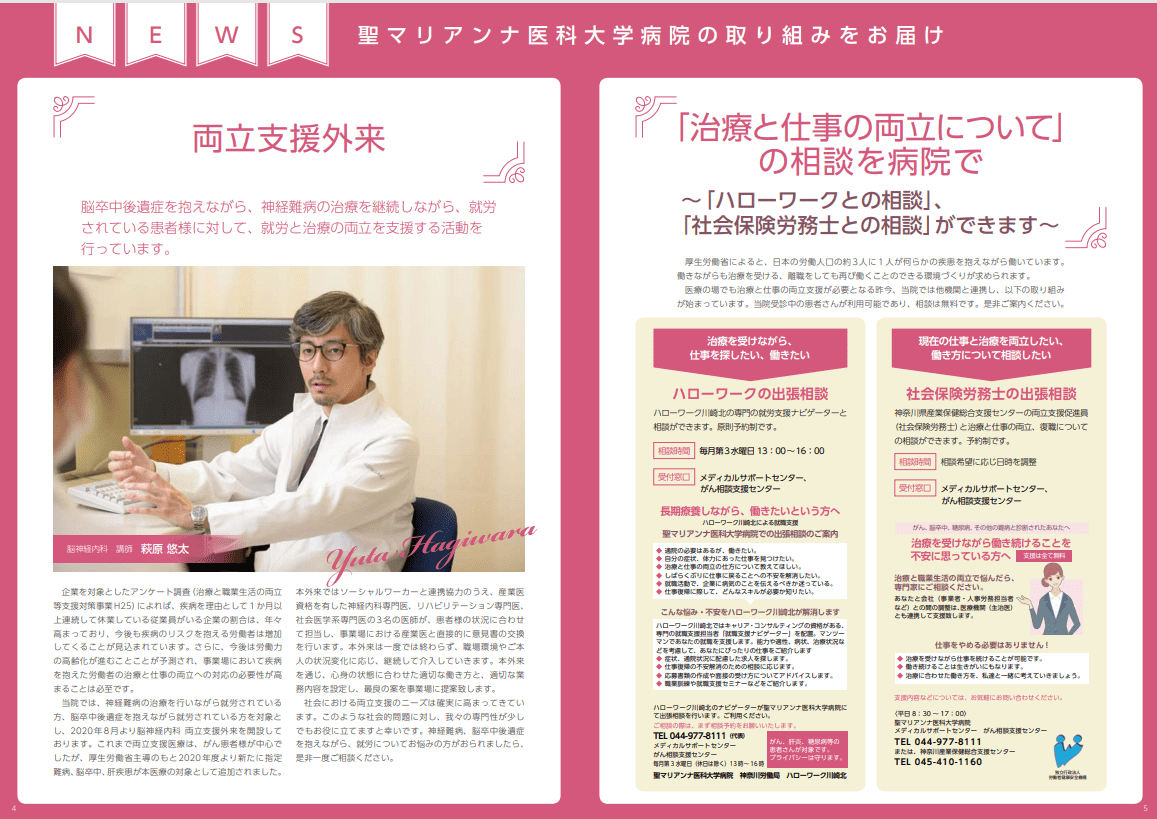 2018年1月から神奈川産業保健総合支援センターを中心に、当院を含む神奈川県内4か所の医系大学病院(北里大学病院、聖マリアンナ医科大学病院、東海大学医学部付属病院、横浜市立大学附属病院)や労災系病院(関東労災病院、横浜労災病院)が連携し、各医療機関における患者さんや職場の上司からの「相談」、「個別訪問支援」及び「個別調整支援」の具体的な事例や、各医療機関での両立支援の普及のための取組等を情報共有する"神奈川両立支援モデル"と称した両立支援活動に参加しています。本モデル活動では、年1-2回の両立支援担当者会議が開催され、積極的に各医療機関の事例紹介・現状や課題を共有し、神奈川県全体の両立支援促進に努めています。また、2019年度からは同センターと協定を締結し、両立支援促進員(社会保険労務士)の出張窓口を増設し、就労患者さんの相談を随時受付できる体制を確保しています。また、2021年4月からはハローワーク川崎北と連携し院内ハローワーク出張窓口を新設し、通院患者さんを中心とした再就職や復職サポート体制を確保しています。