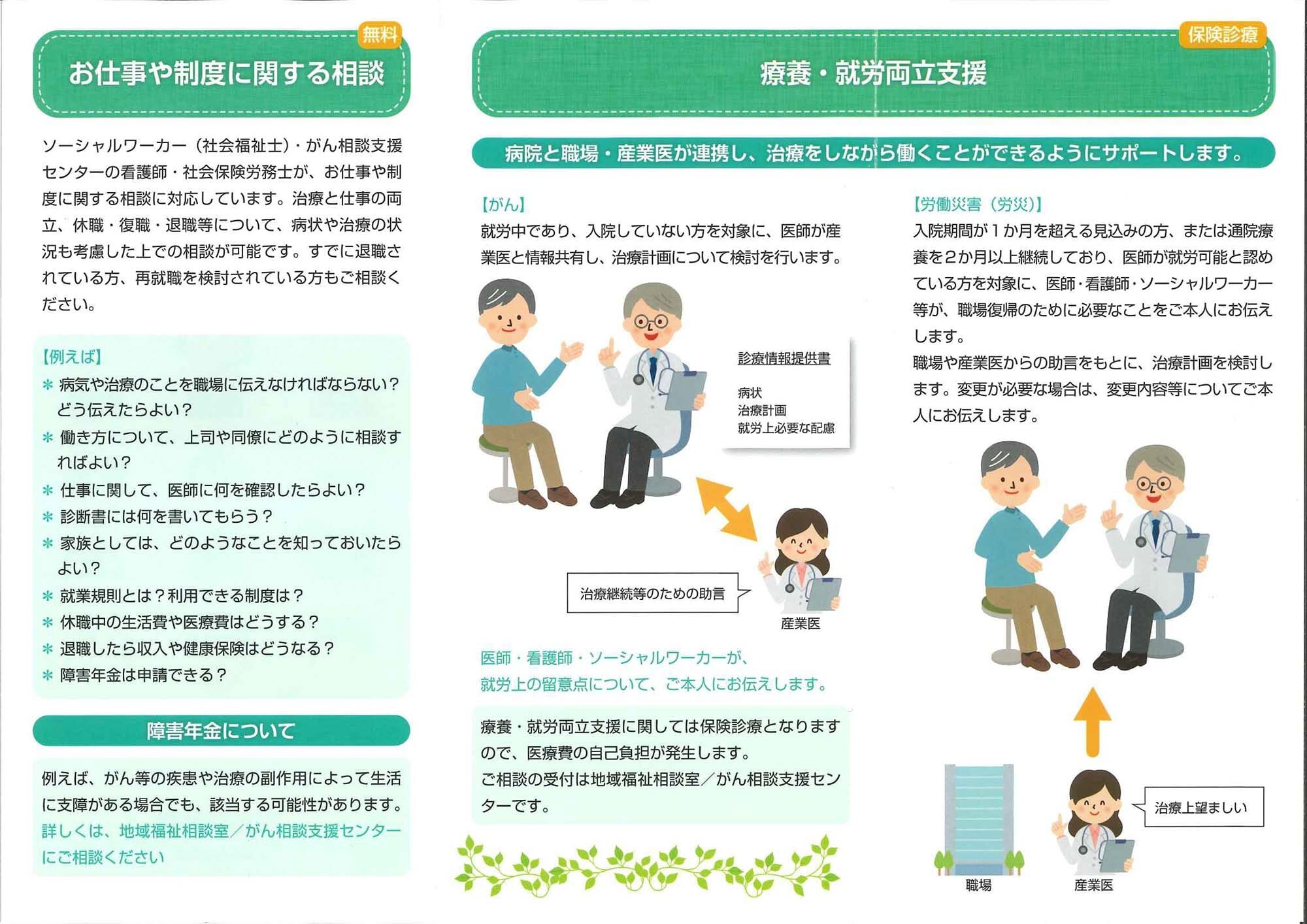 ポスター掲示、リーフレット配架、ホームページを配架しています。また外来受診や入院時のスクリーニングシートに「仕事に関する相談希望の有無」欄を設け、ご希望者に対応できるようにしています。