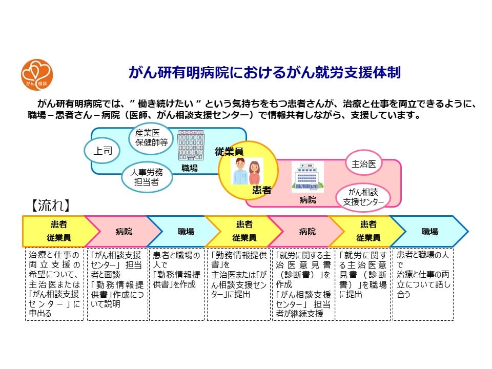がん相談支援センターとなっています。就労に関する相談があった場合は、がん相談支援センターを紹介するよう院内職員への周知活動(新入職者へのオリエンテーション・看護部継続教育研修・職員向けデジタルサイネージ・院内WEBセミナーでの紹介等)を実施しています。