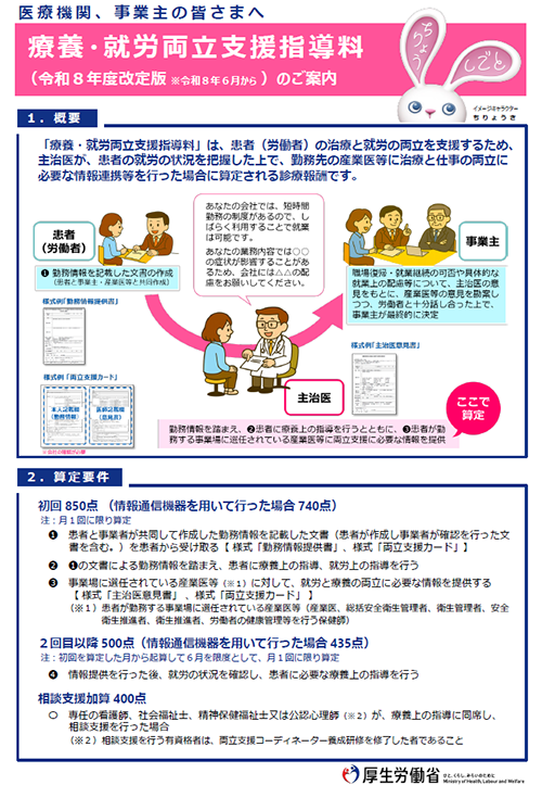 「療養・就労両立支援指導料」は、患者(労働者)の治療と就労の両立を支援するため、主治医が、患者の就労の状況を把握した上で、勤務先の産業医等に治療と仕事の両立に必要な情報連携等を行った場合に算定される診療報酬です。