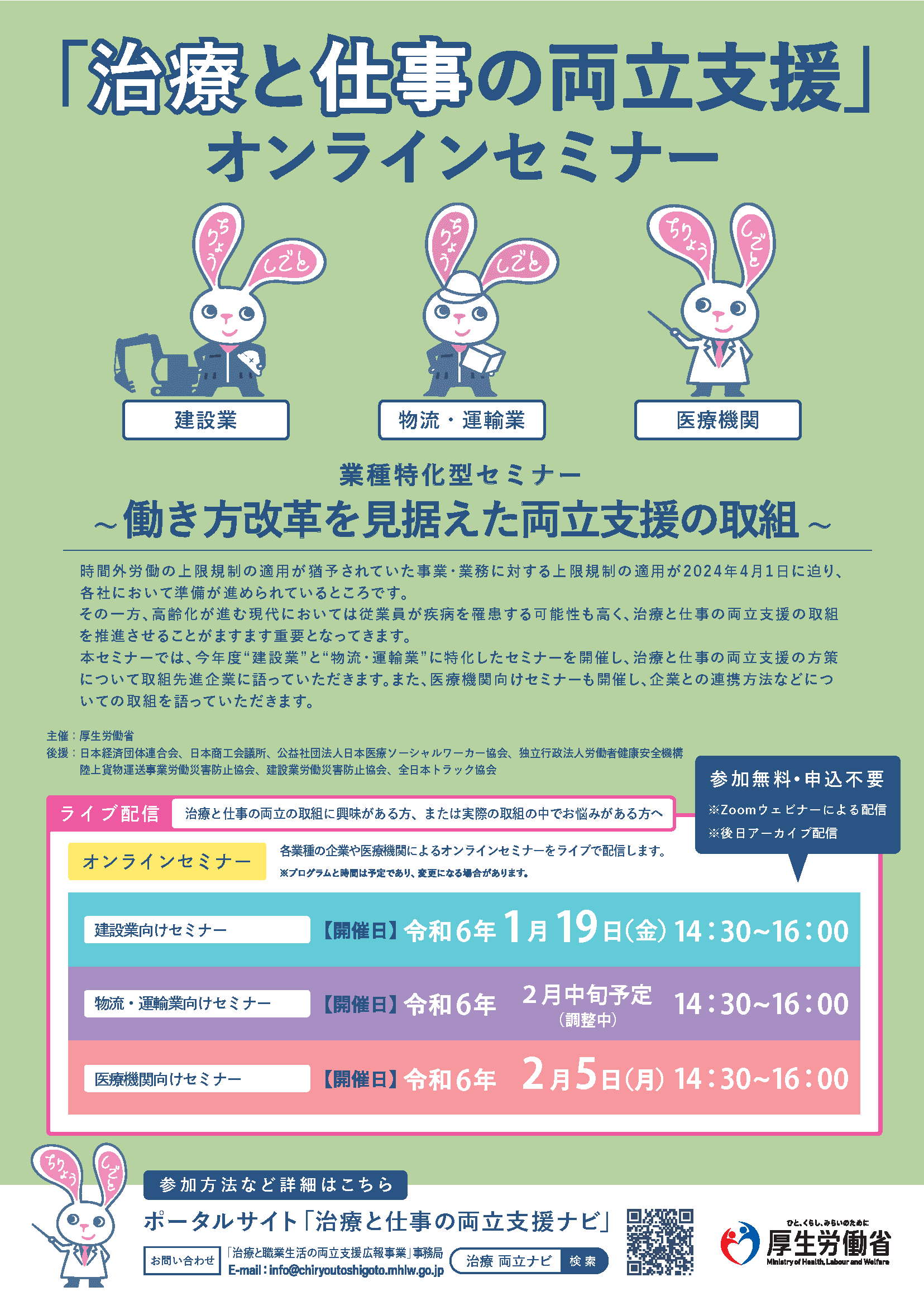 本セミナーでは、今年度"建設業"と"物流・運輸業"に特化したセミナーを開催し、治療と仕事の両立支援の方策について取組先進企業に語っていただきます。