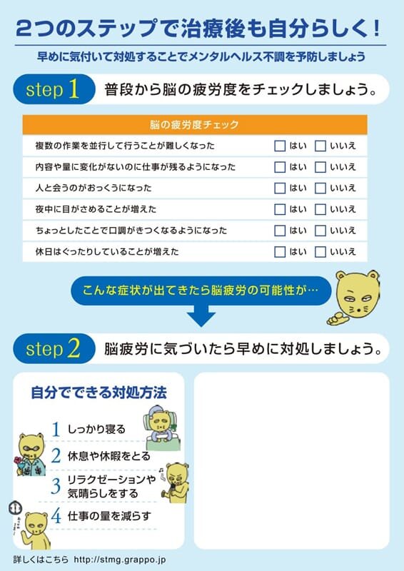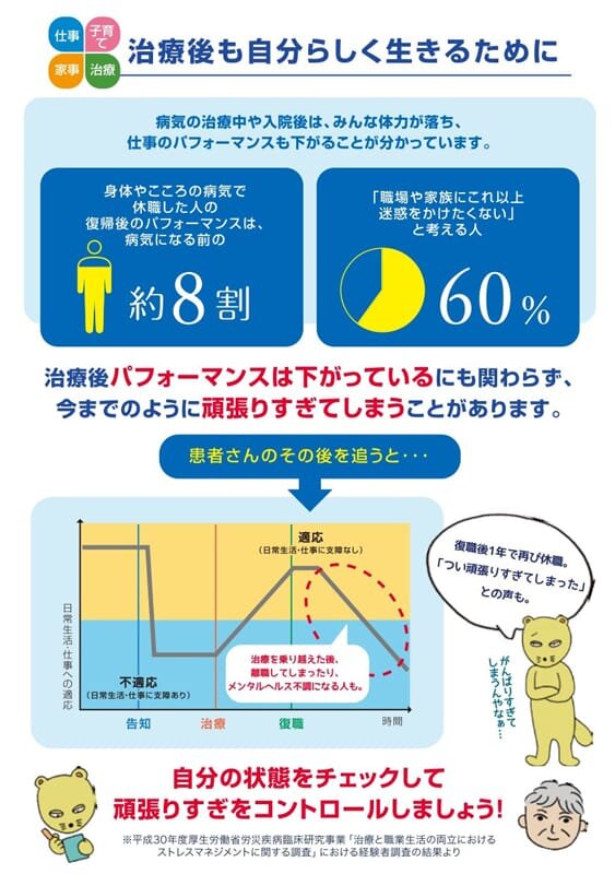 平成30年度厚生労働省労災疾病臨床研究事業費補助金「治療と職業生活の両立におけるストレスマネジメントに関する研究」(研究代表者:平井啓)班作成「治療と仕事を両立するときに、不調にならないためのストレスマネジメントガイドブック」