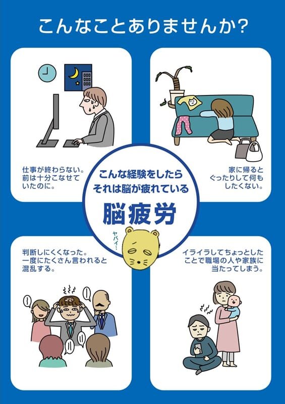 このような業務時間やミスの増加、判断が難しくなるなどのパフォーマンスの低下は、仕事や日々の活動で必要な情報処理を担う、我々の脳の前頭葉の機能が低下することで生じると考えられており、前頭葉の機能が低下した状態を研究班では「脳疲労」状態と呼んでいる。この脳疲労状態を放置し一定期間経過すると、うつ状態やうつ病に移行すると考えられているため、「脳疲労」の状態であることに早く気づき、早めの対処を行うことが重要である。どのような状態が脳疲労状態であるかというと、「以前こなせていた仕事がなかなか終わらない」、「家に帰るとぐったりして何もしたくない」、「判断しにくくなった、一度にたくさんのことを言われると混乱する」、「イライラしてちょっとしたことで職場の人や家族にあたってしまう」などに当てはまるような状態である。研究班では、脳疲労尺度を作成し、特設サイト(参考リンク参照)では脳疲労状態をチェックできるようにしている。